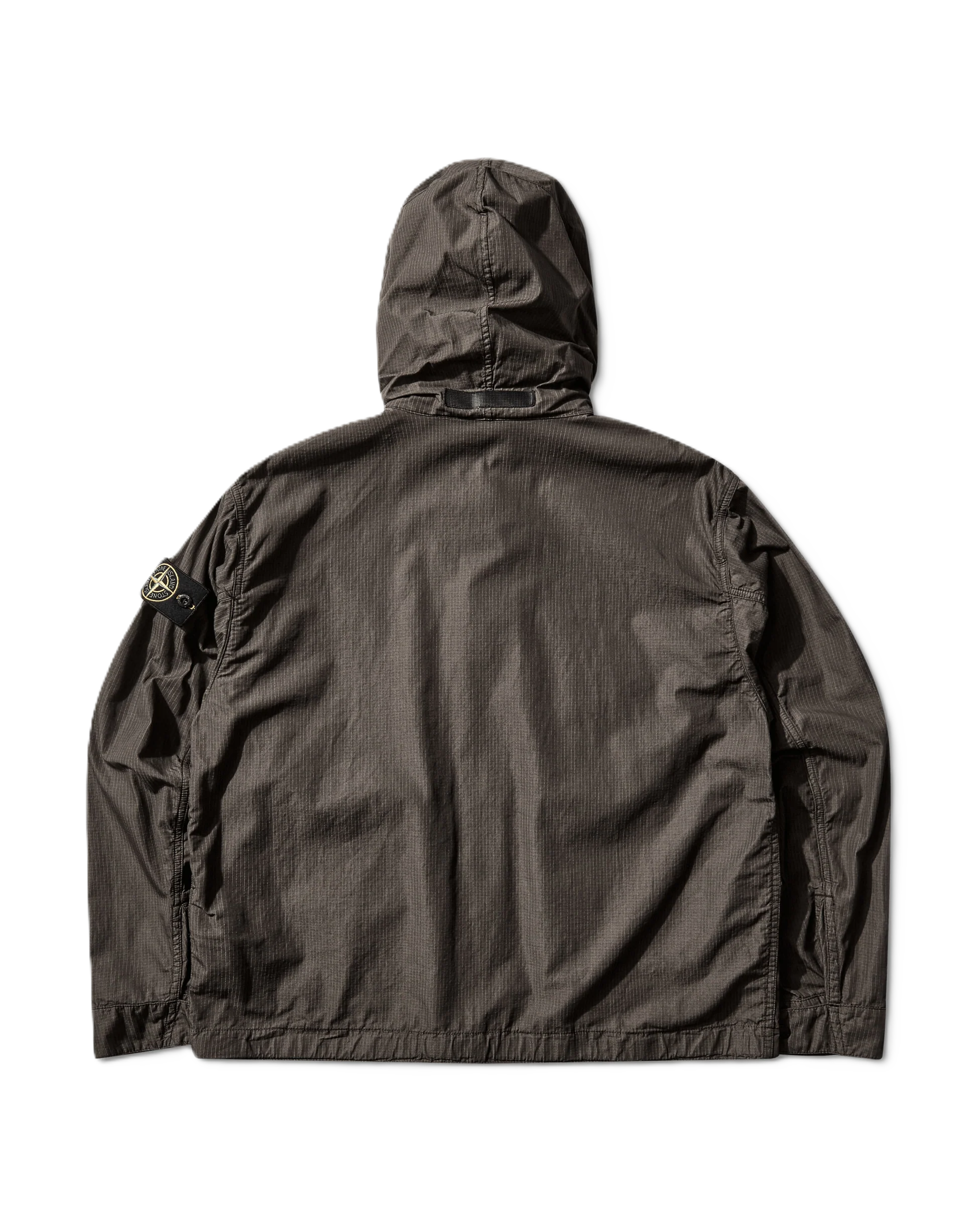 Giacca Stone Island in micro ripstop di cotone e nylon, colore antracite con cappuccio ripiegabile, tasche multiple, polsini regolabili, orlo con coulisse e cerniera a doppio cursore nascosta. Tinto in capo con trattamento anti-goccia.