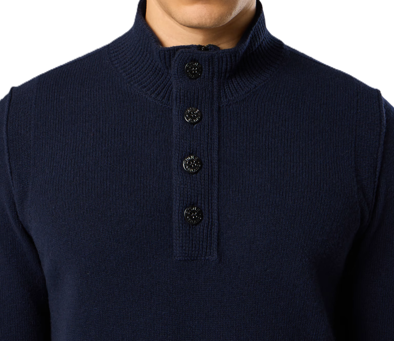 Maglione con zip corta in misto lana d'agnello e nylon con finta con bottoni foderata in feltro, colletto a costine con bordo interno in feltro e fasce a punto rovescio. Finezza 7.