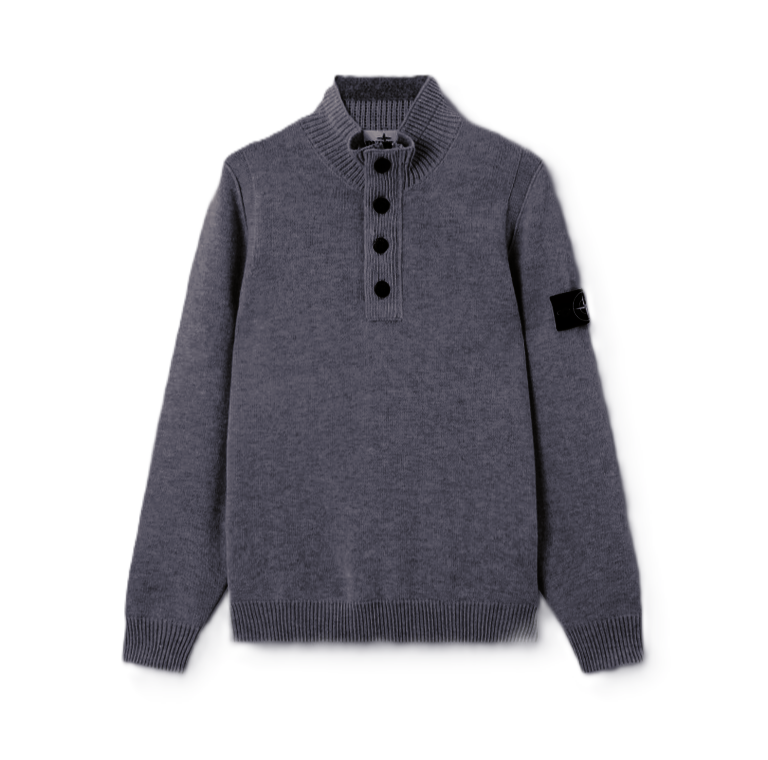 Maglione con zip corta in misto lana d'agnello e nylon con finta con bottoni foderata in feltro, colletto a costine con bordo interno in feltro e fasce a punto rovescio. Finezza 7.