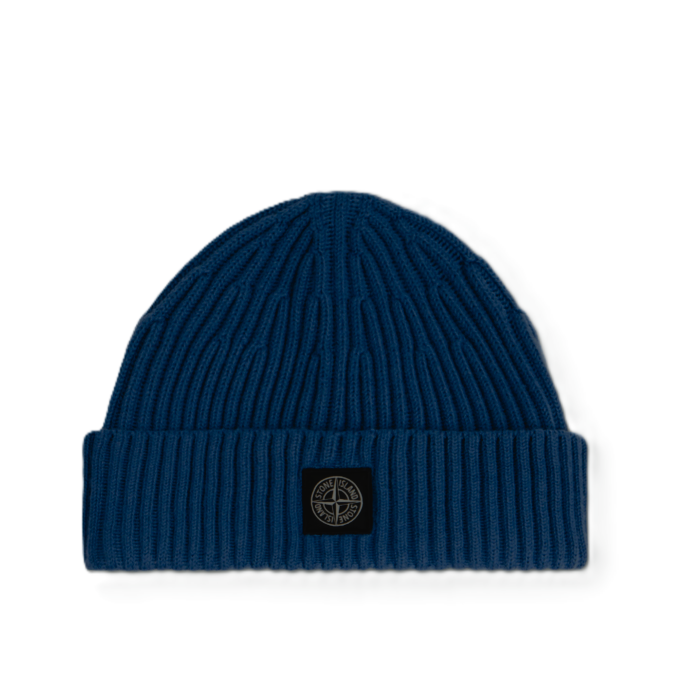 Cuffia navy in lana vergine, lavorazione in maglia a coste, caratteristico motivo Compass