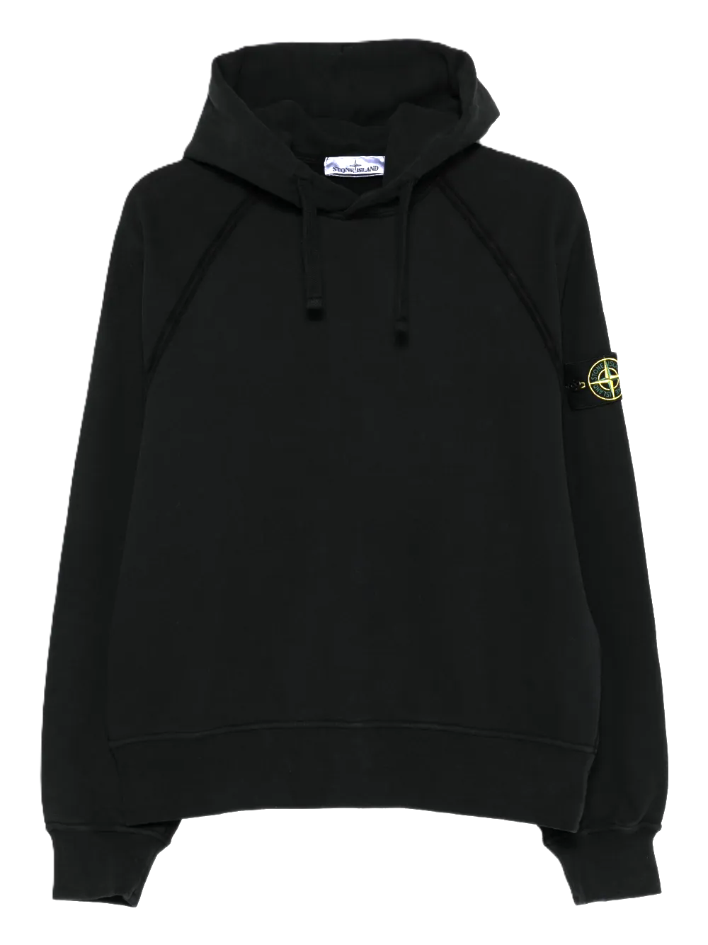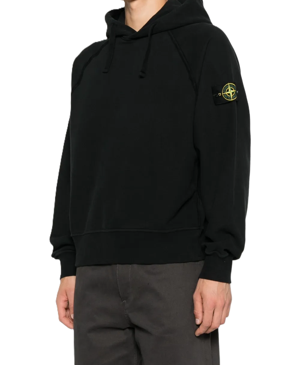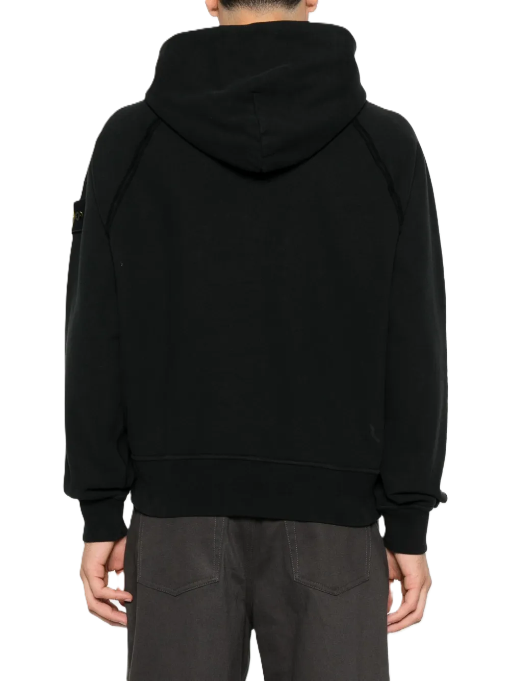 Felpa color nero, maniche raglan, scollo con cappuccio, applicazione con logo