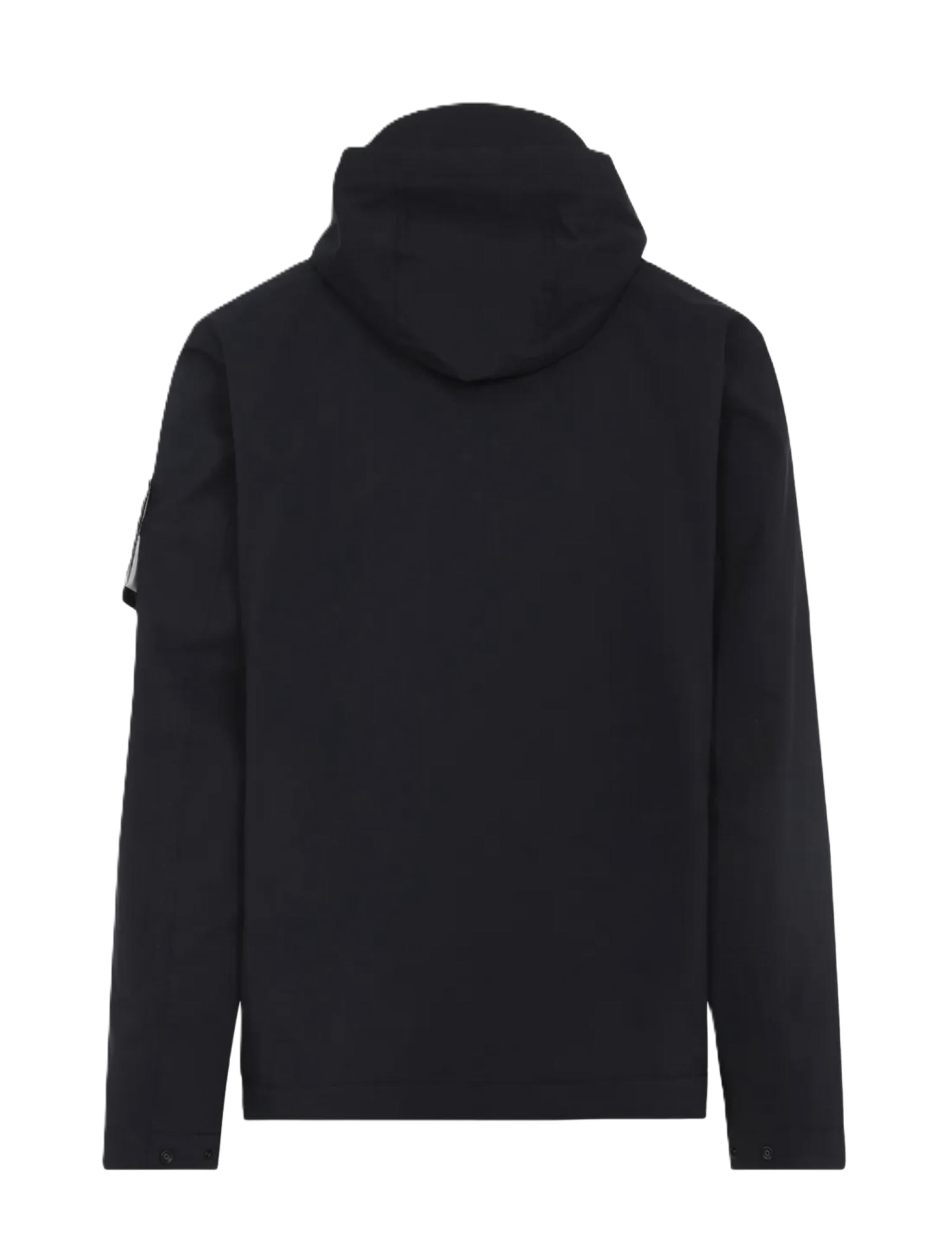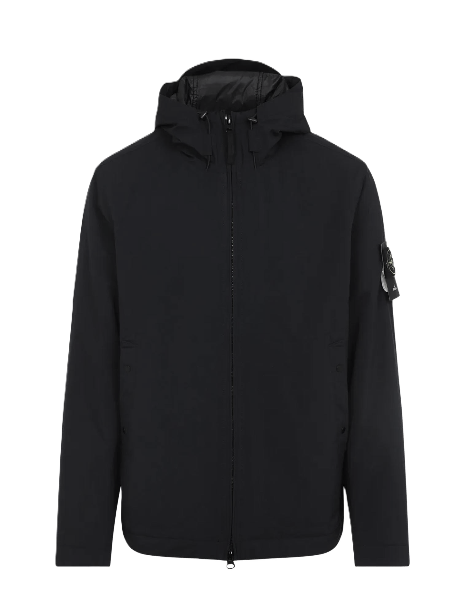 Giubbotto con zip nero, cappuccio e coulisse, due tasche, dettaglio con applicazione