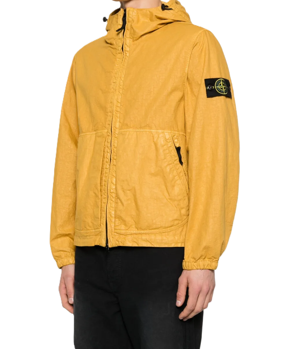 Giacc con cappuccio color senape, chiusura con cerniera, toppa con logo sul petto, tasche anteriori con cerniera
