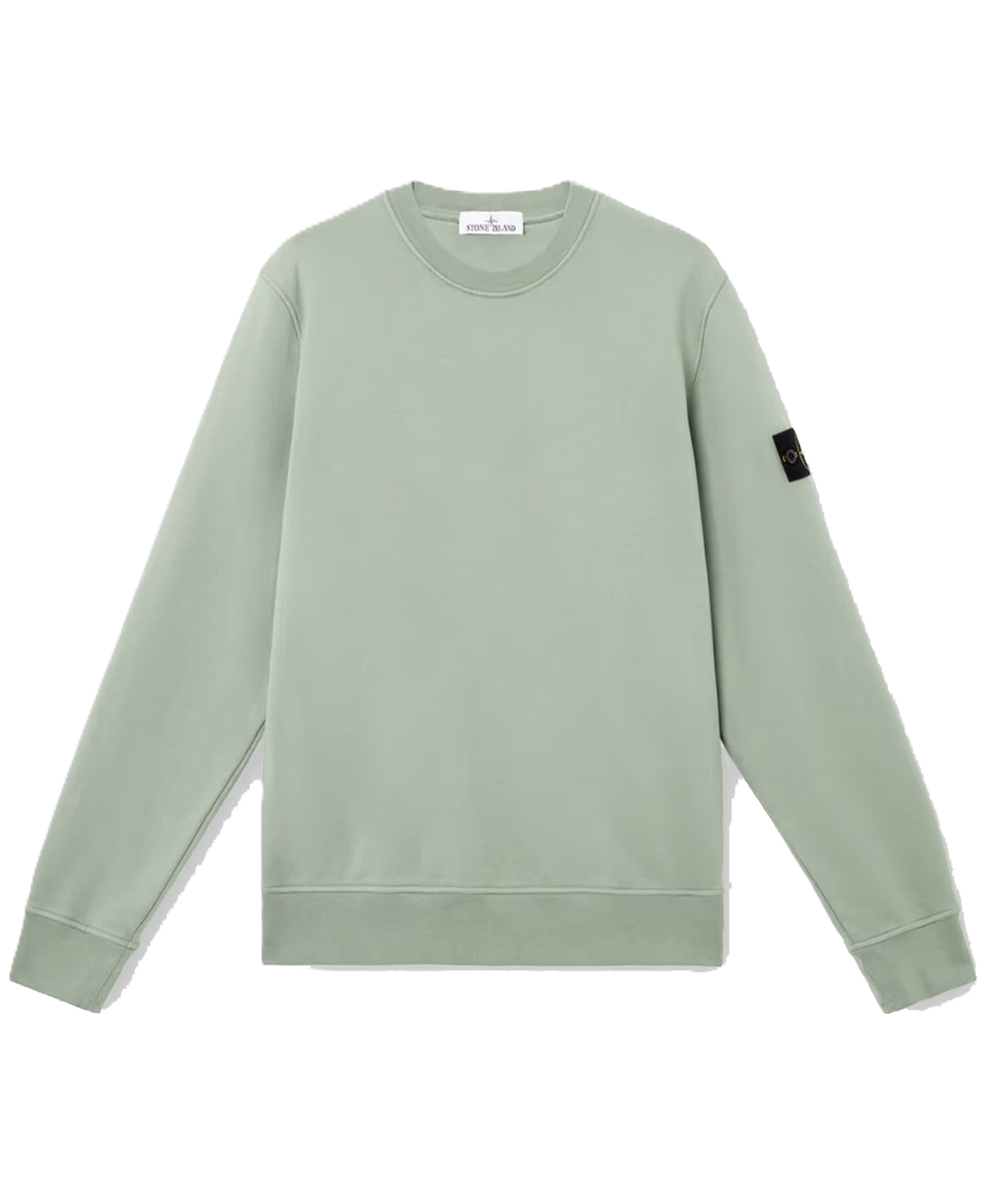 Maglione color sage girocollo, maniche lunghe, polsini a coste, orlo a coste, applicazione con logo