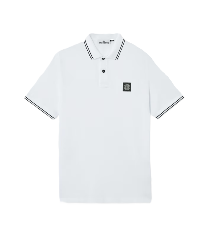 Polo a manica corta in cotone biologico e piquet di elastan con due bottoni, logo Compass sul petto e righe colorate a contrasto su collo e bordo manica.