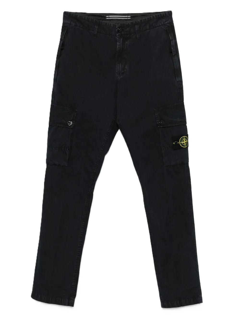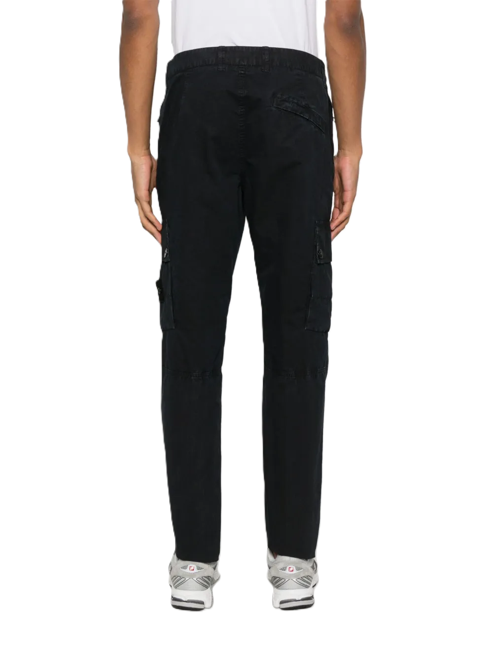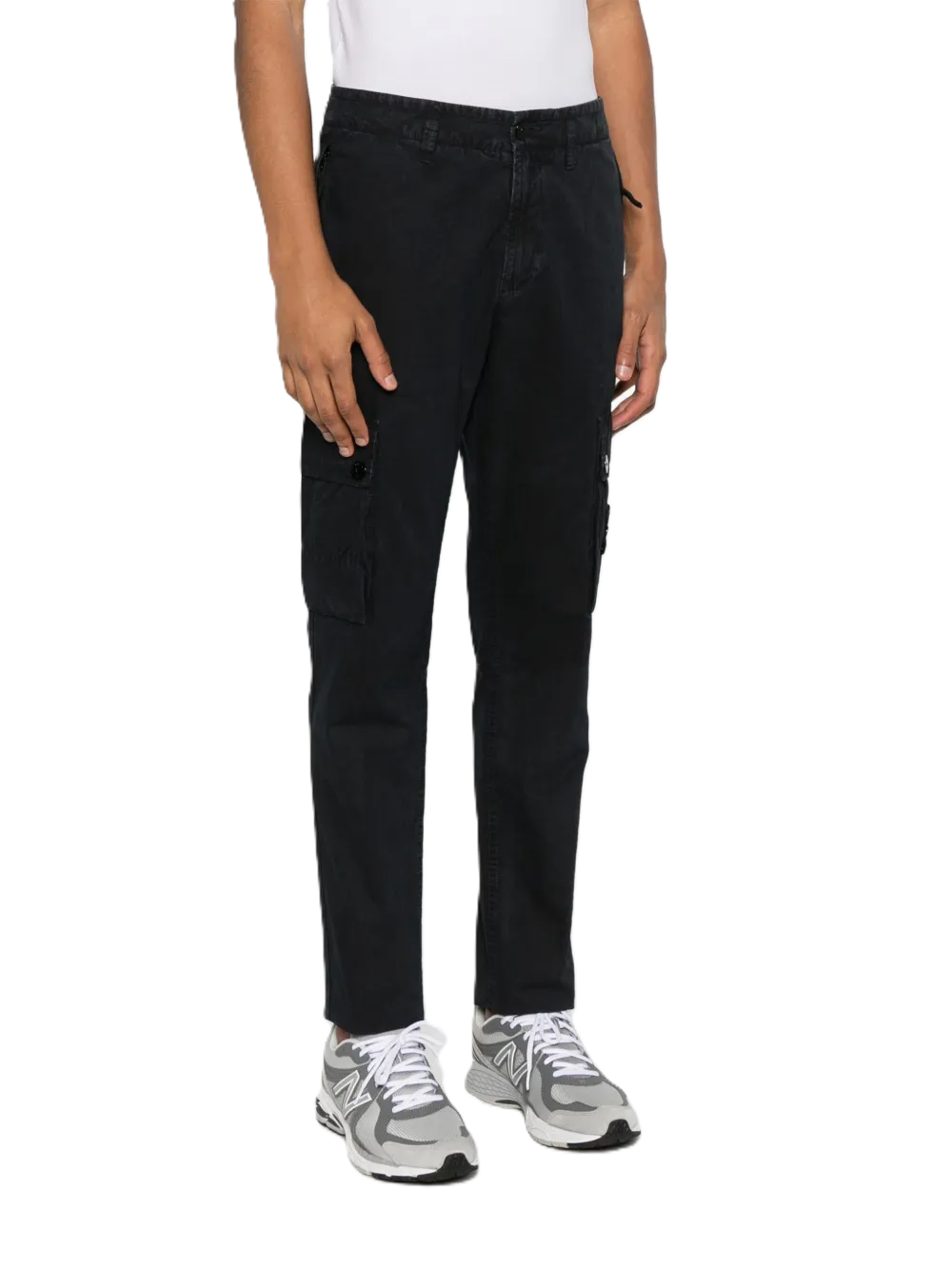 Pantalone slim cargo blu notte, chiusura frontale con bottoni e zip, due tasche laterali con zip, tasca posteriore a filetto, passanti
