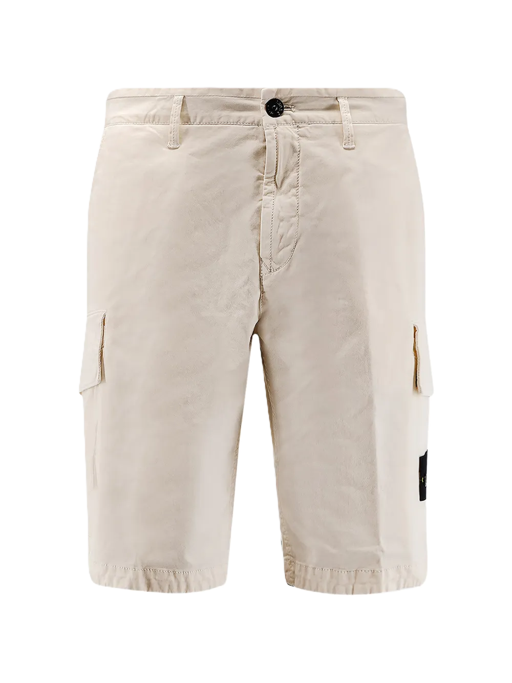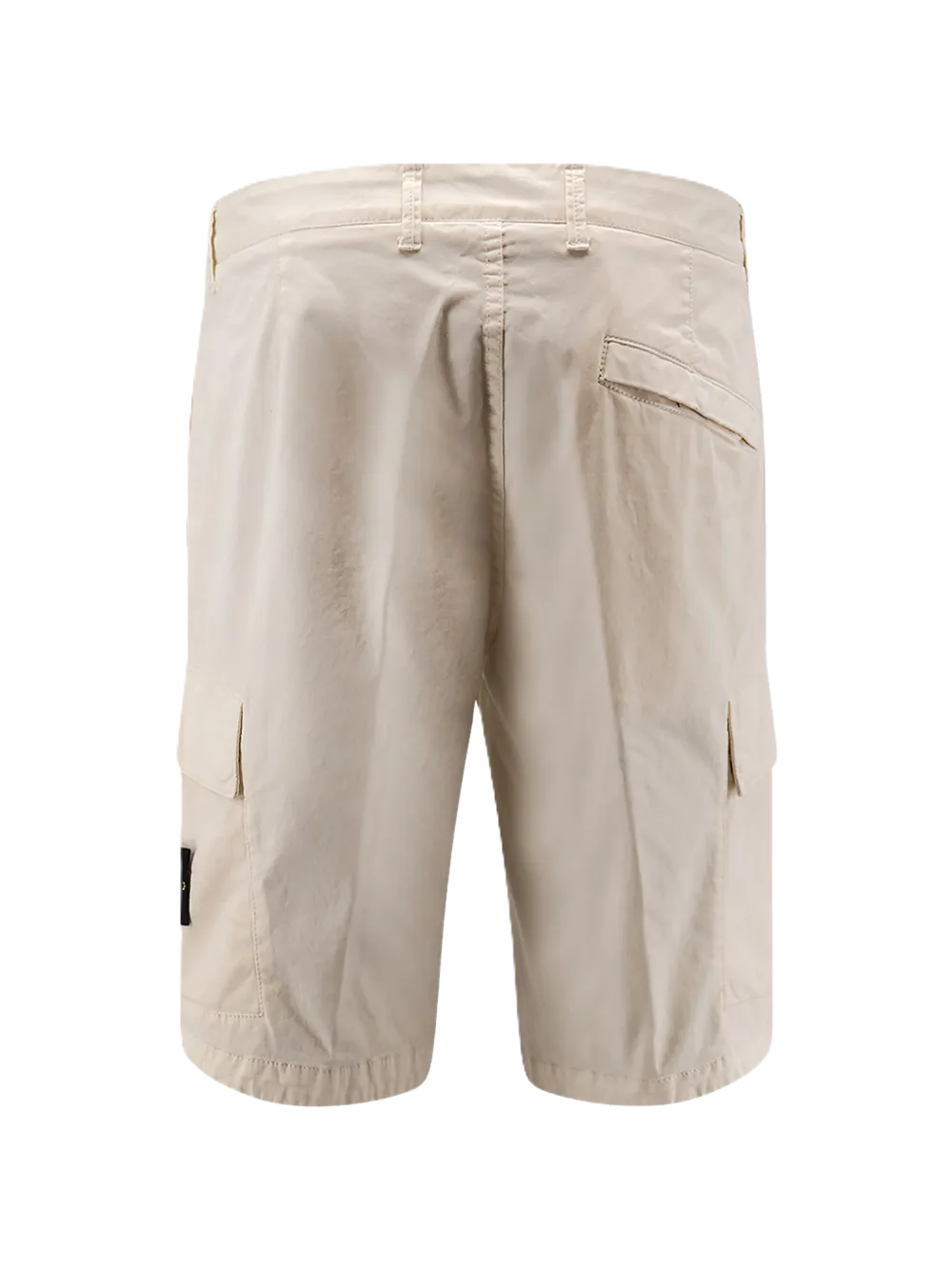 Pantalone bermuda slim color avorio, tasche cargo, applicazione, chiusura con bottoni, passanti per cintura, tasca posteriore a filetto