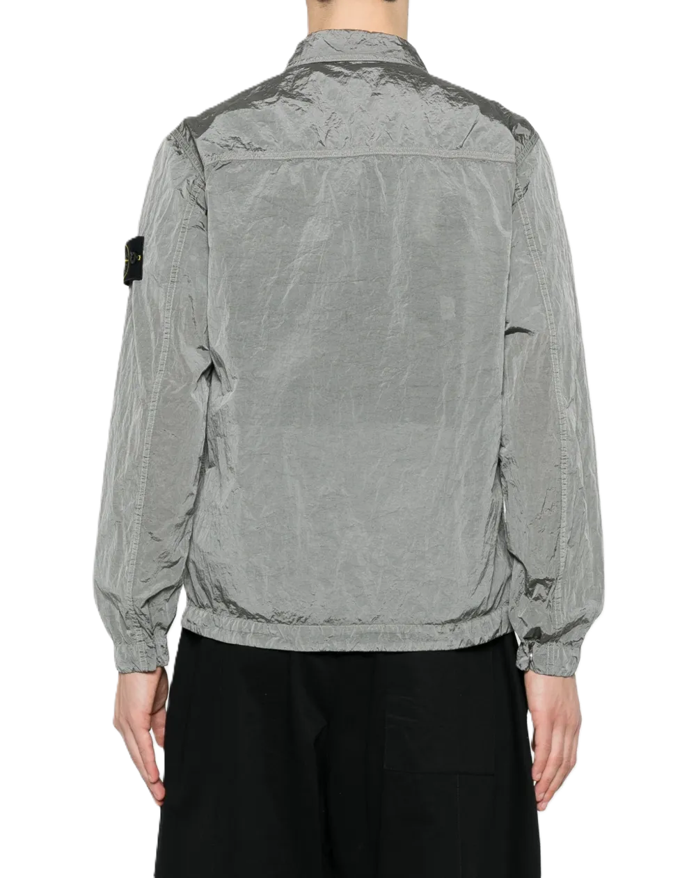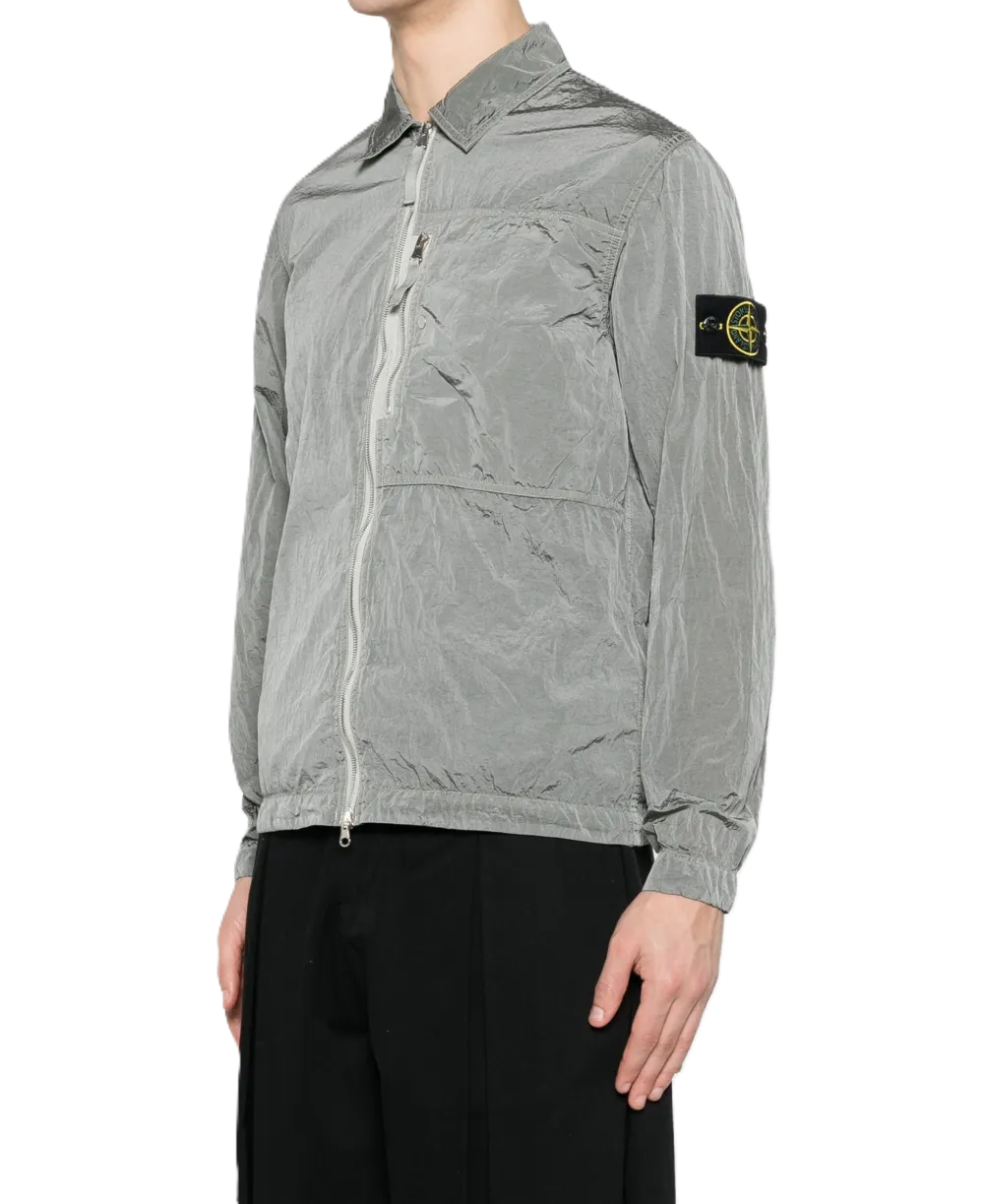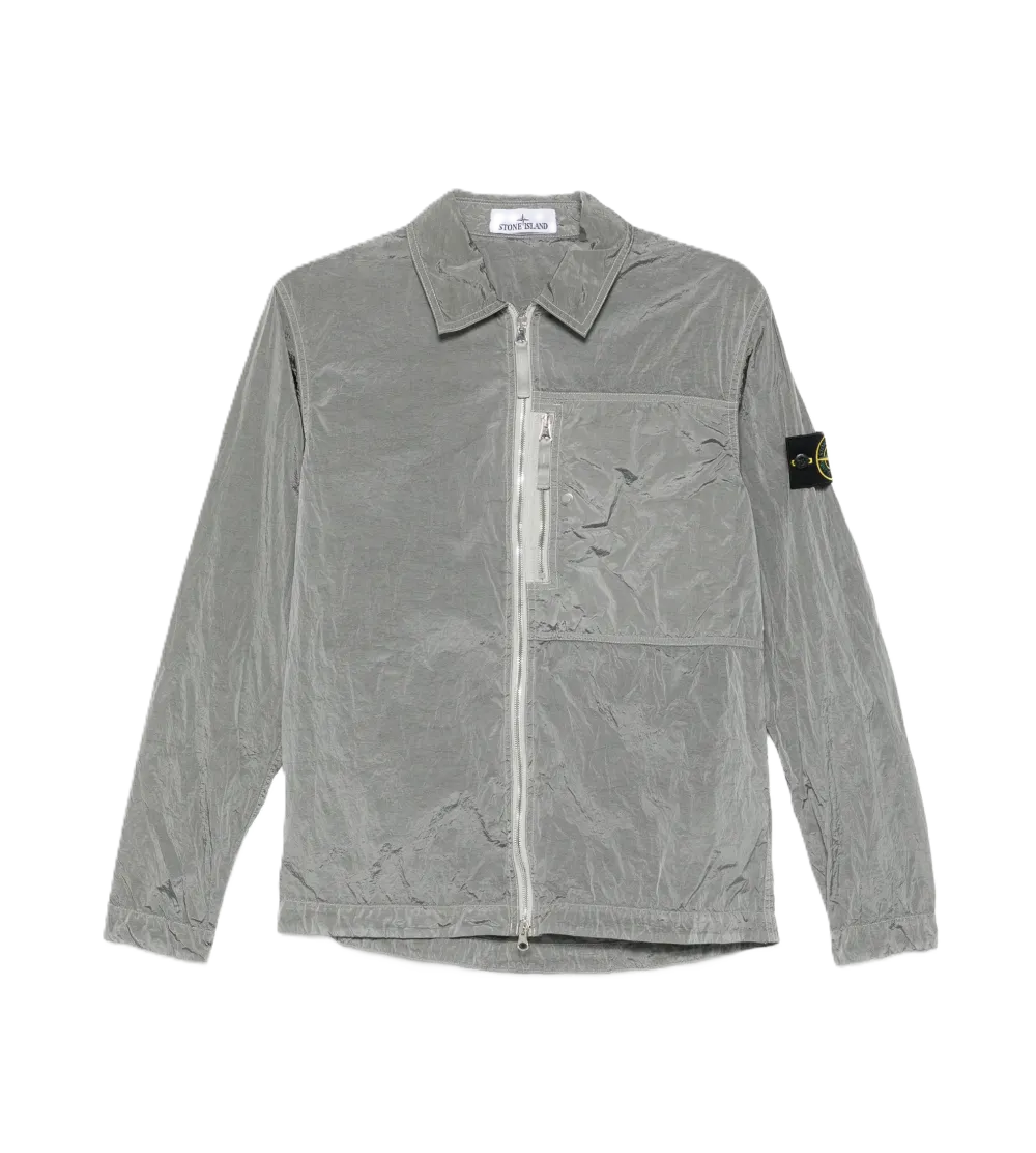 Overshirt grigio, chiusura con zip, taschino sul petto, colletto a punta, maniche lunghe, cuciture tono su tono