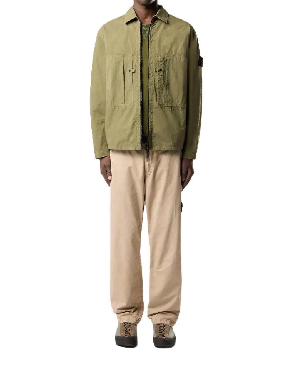 Overshirt color kaki, chiusura con zip, tasche sul petto, maniche lunghe, applicazione con logo