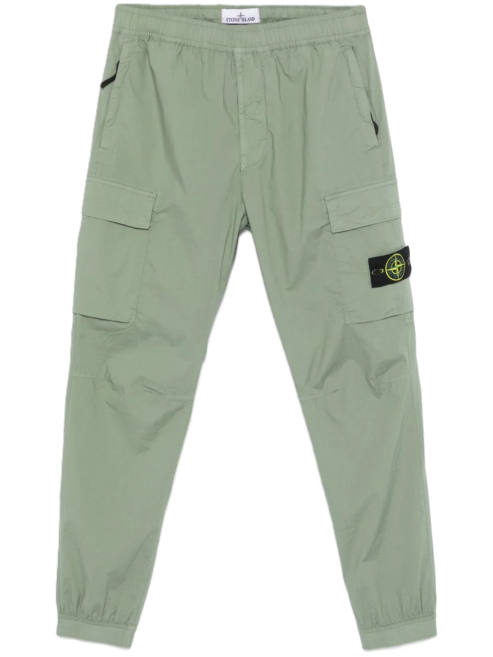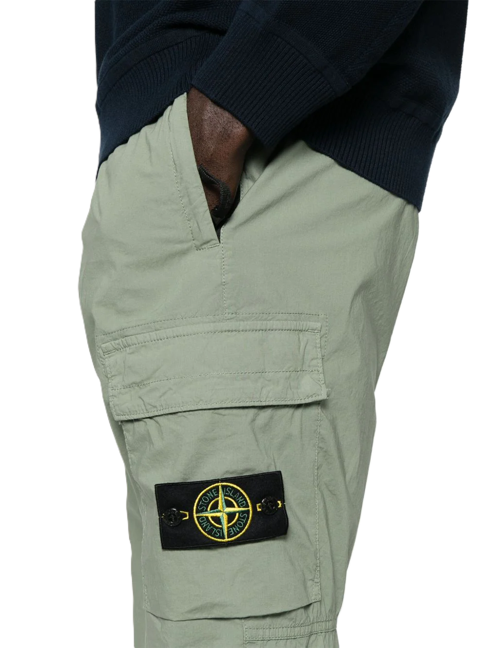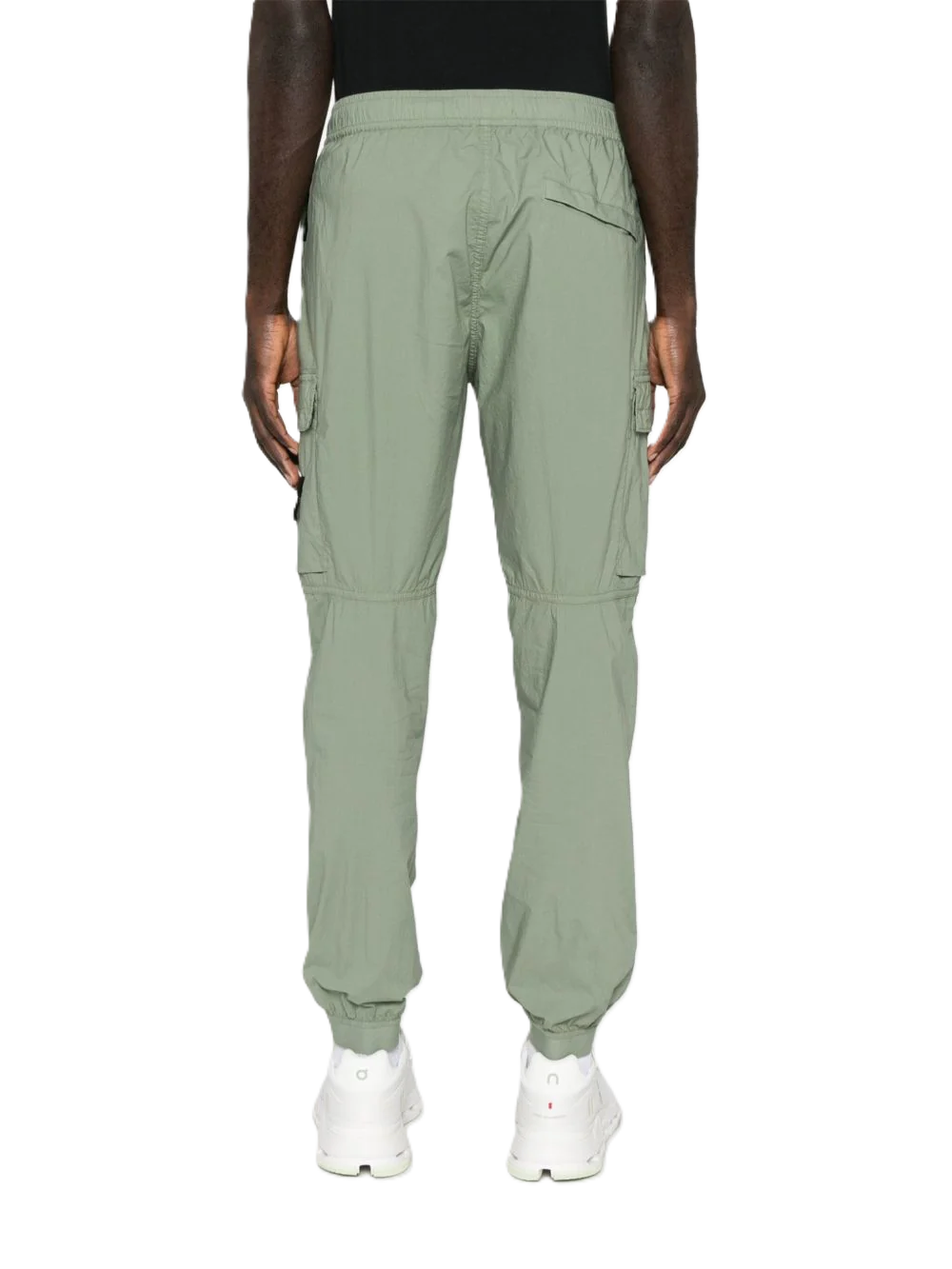 Pantalone verde salvia, vita con coulisse interna, due tasche laterali con zip, tasca cargo laterale, tasca posteriore a filetto