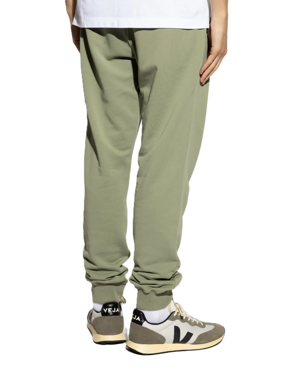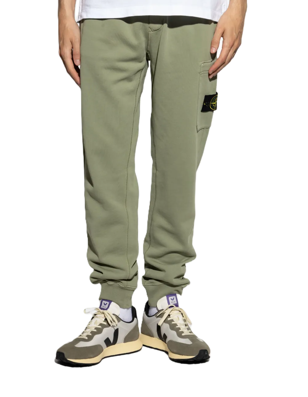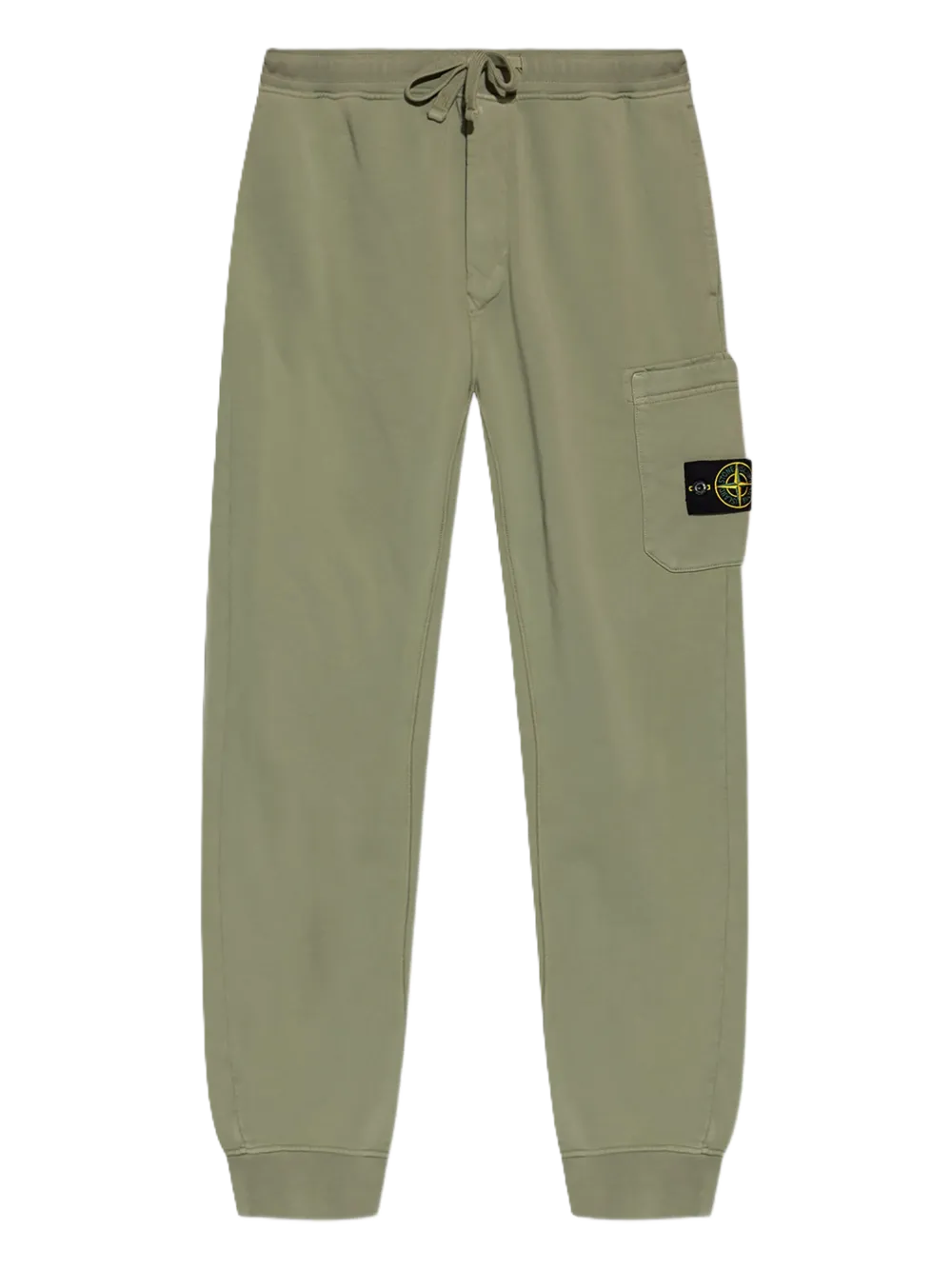 Pantalone verde, chiusura a coulisse, dettaglio con cuciture laterali, orli a coste, tasche applicate, caratteristica applicazione Compass removibile