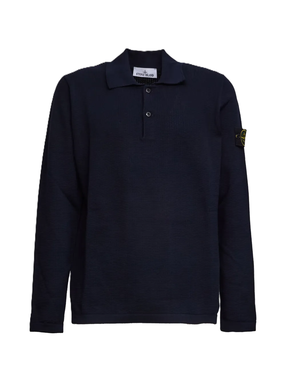 Polo blu navy, colletto stile polo, pattina a due bottoni, maniche lunghe, dettaglio logo