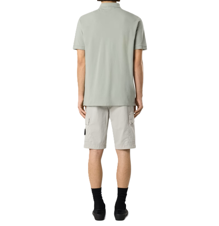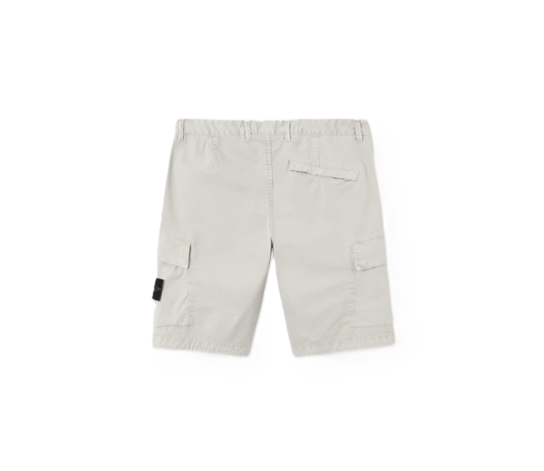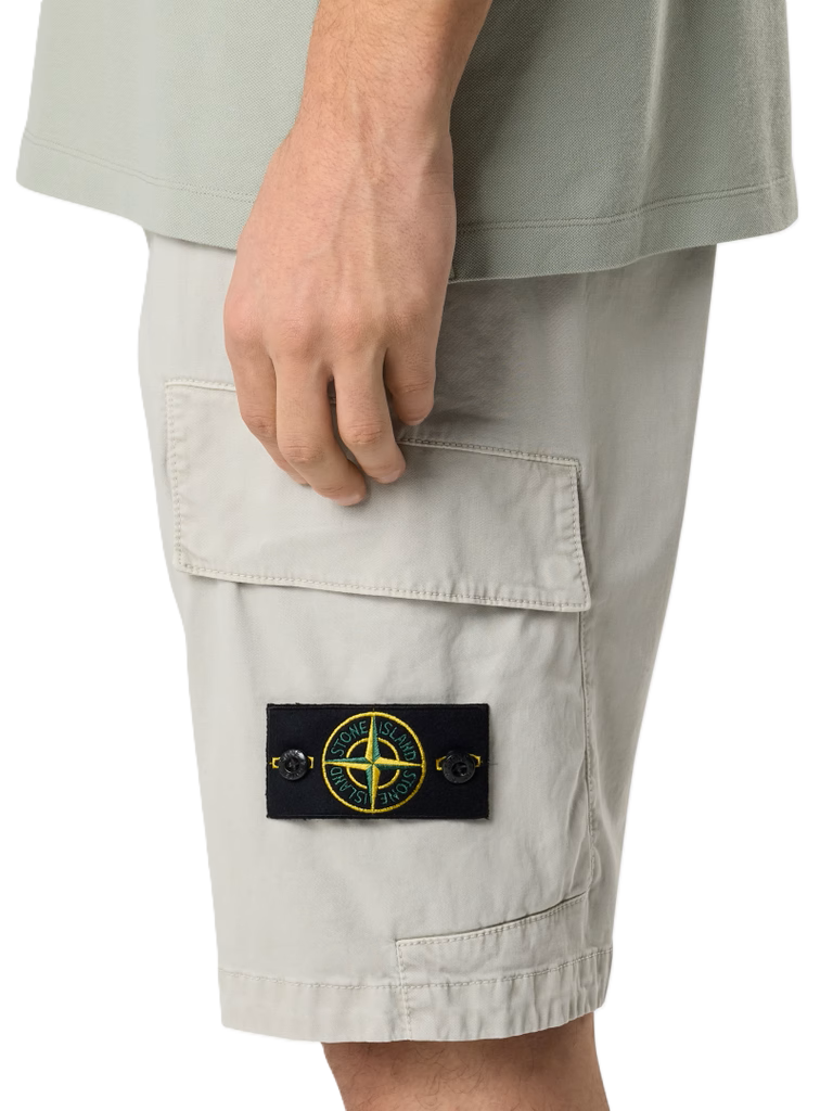Shorts cargo in broken twill di cotone biologico stretch, con tasche multiple e cuciture asimmetriche. Modello tinto in capo con effetto 'OLD', per un aspetto leggermente vissuto.