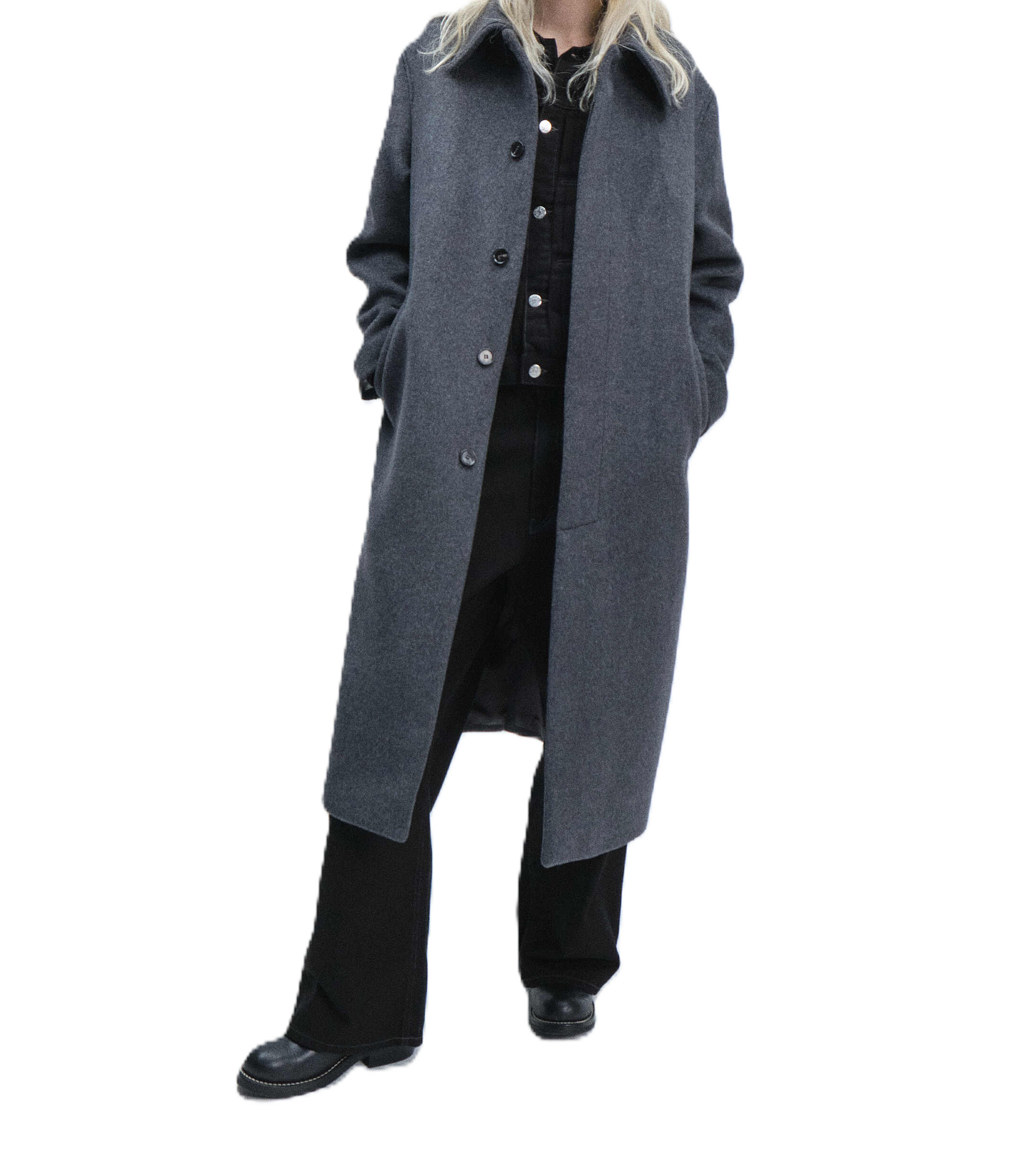 Cappotto invernale grigio by Sunflower con chiusura frontale a bottoni, maniche lunghe, collo regolare, tasche.