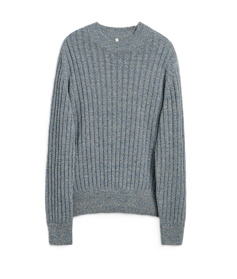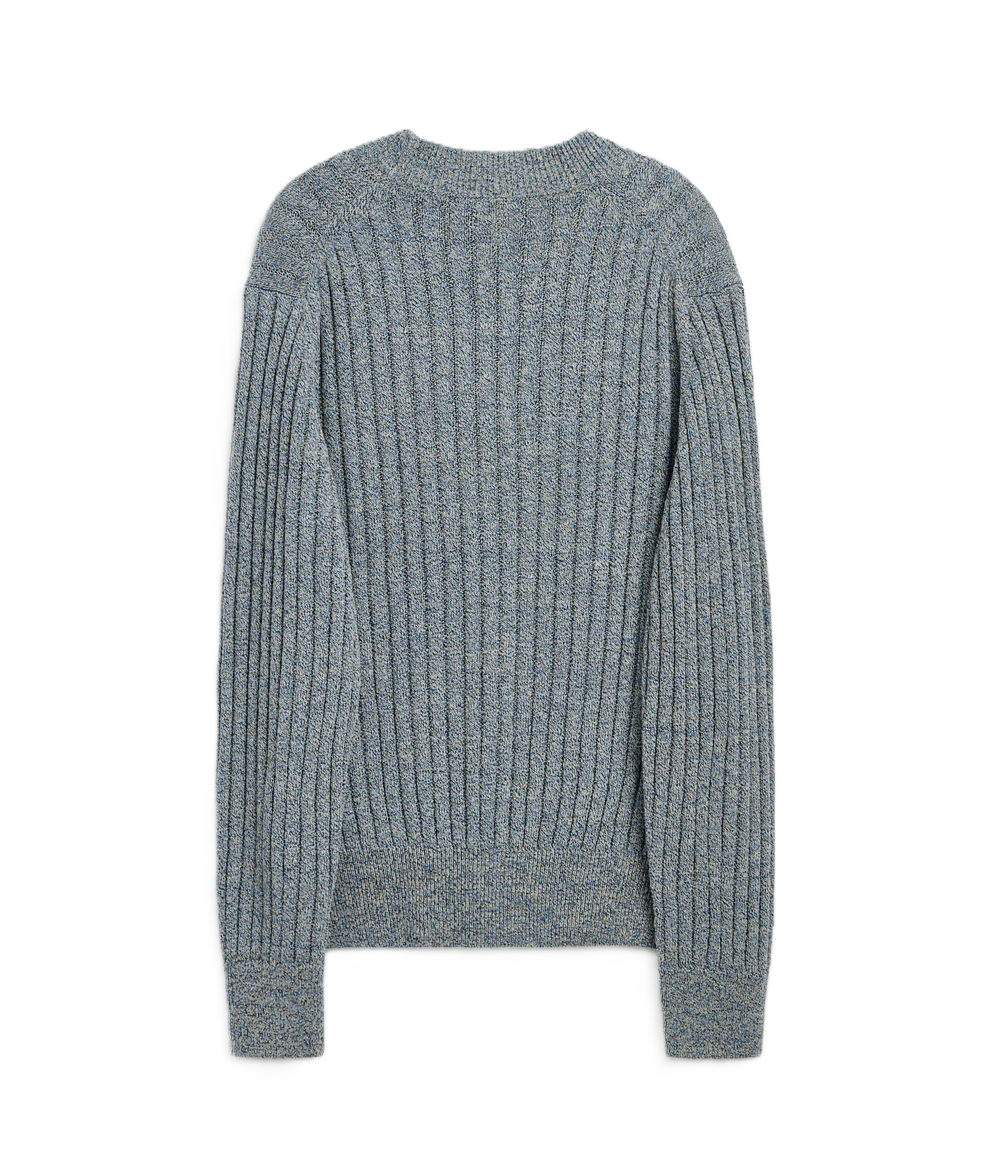 Maglia girocollo a coste 7gg in filato di cotone e lino con effetto moulines. Collo, polsini e orlo a coste. Vestibilità leggermente corta.