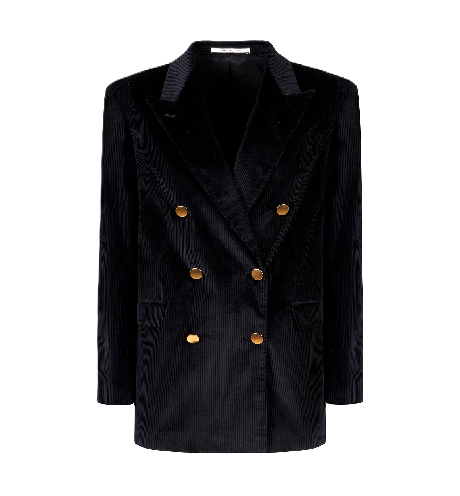 Giacca in Velluto liscio di cotone con rever a lancia, chiusura frontale doppiopetto con bottoni dorati, vestibilità avvitata, taschino profilato sul petto e tasche frontali con patta. Colore: nero