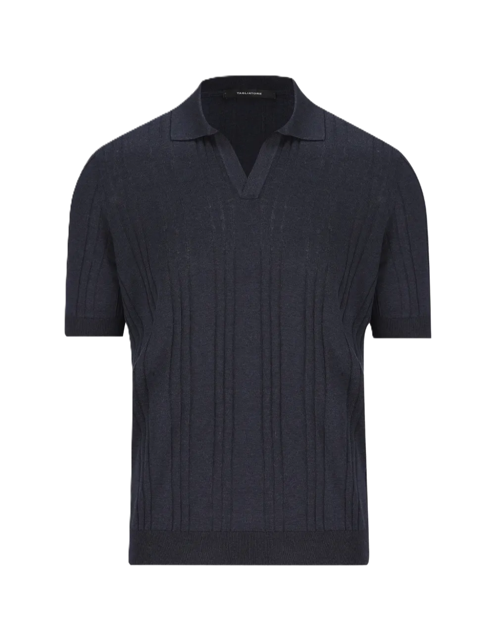 Polo blu scuro, lavorazione in maglia a coste, scollo a V, maniche corte, 100% seta
