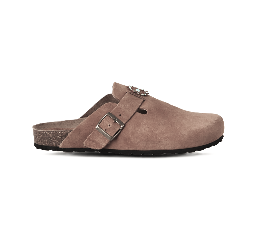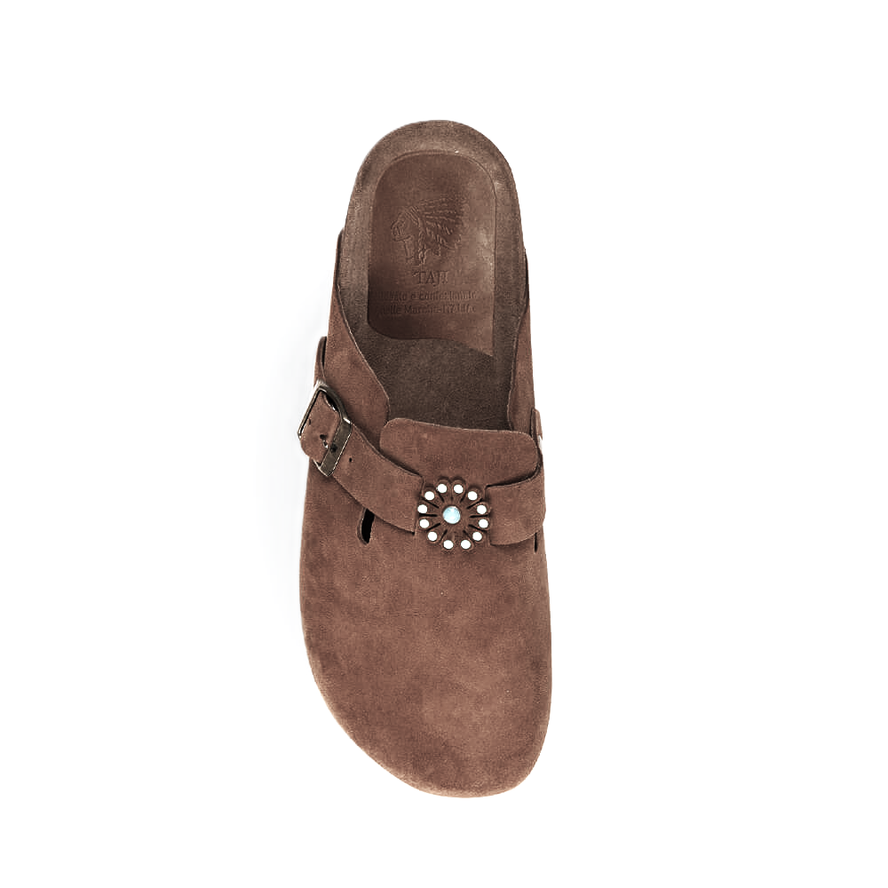 Sabot con 1 fibbia, suola anatomica foderata in pelle di vitello, tomaia e fodera in pelle di vitello scamosciato color nero e ricami con pietre color turchese.