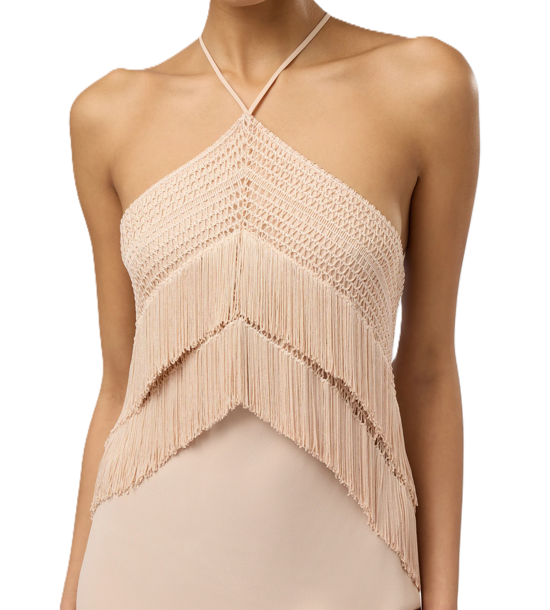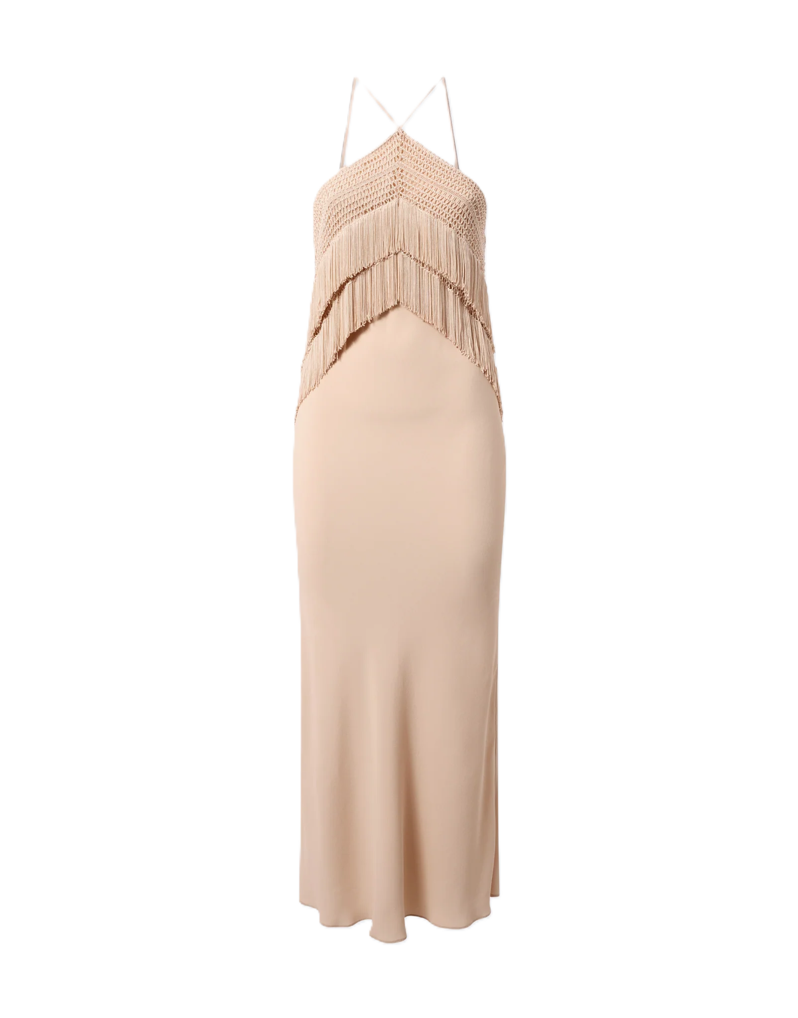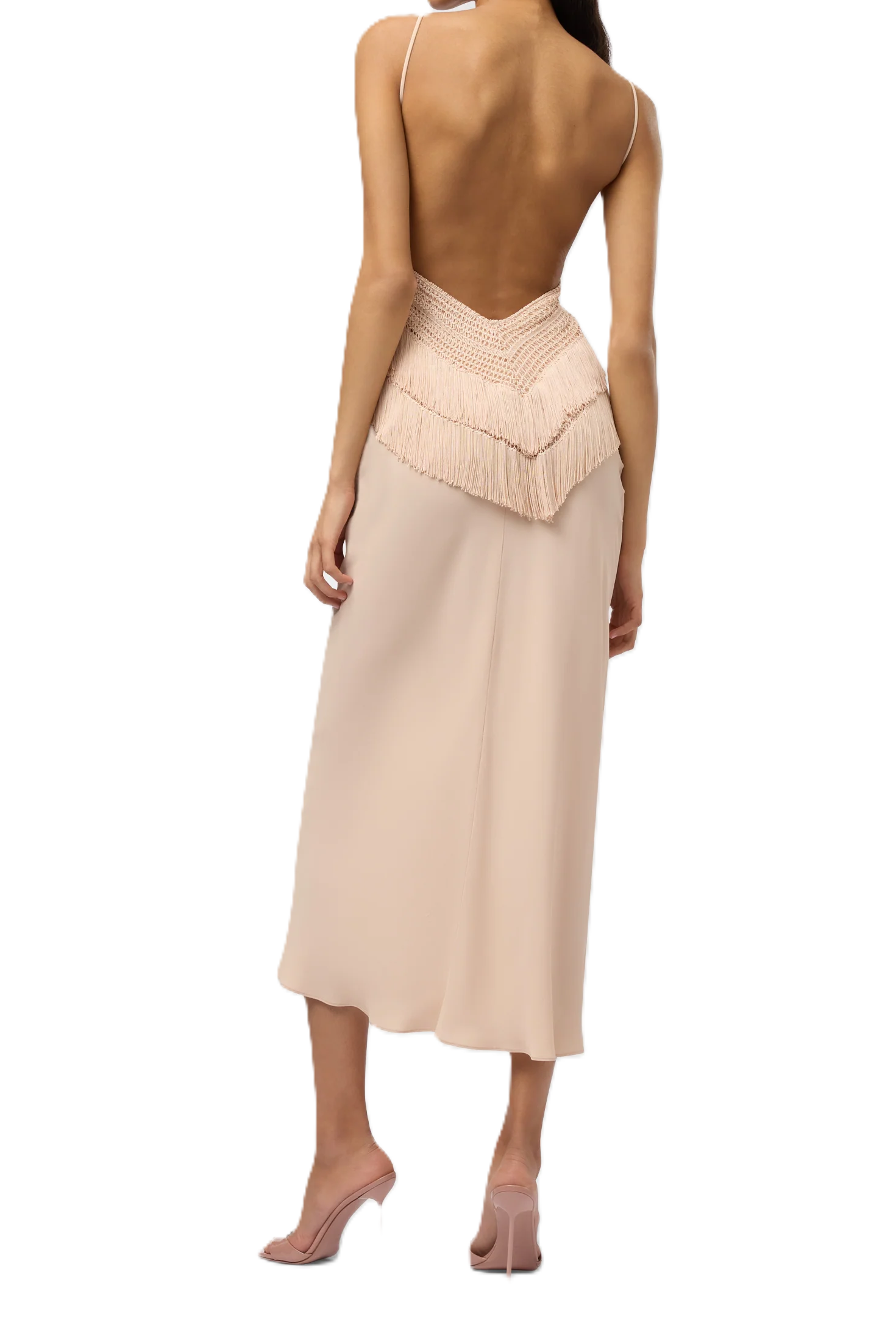 L'abito midi Reina è realizzato in crêpe de chine color pesca. Presenta un corpetto a fascia con sottili laccetti che creano uno scollo all'americana e una scollatura profonda sulla schiena. Le cuciture traforate e le frange multistrato che rifiniscono l'orlo superiore aggiungono texture al modello.