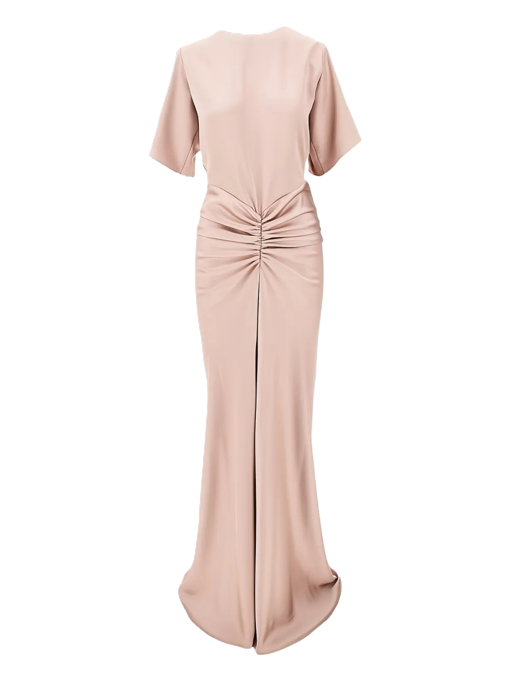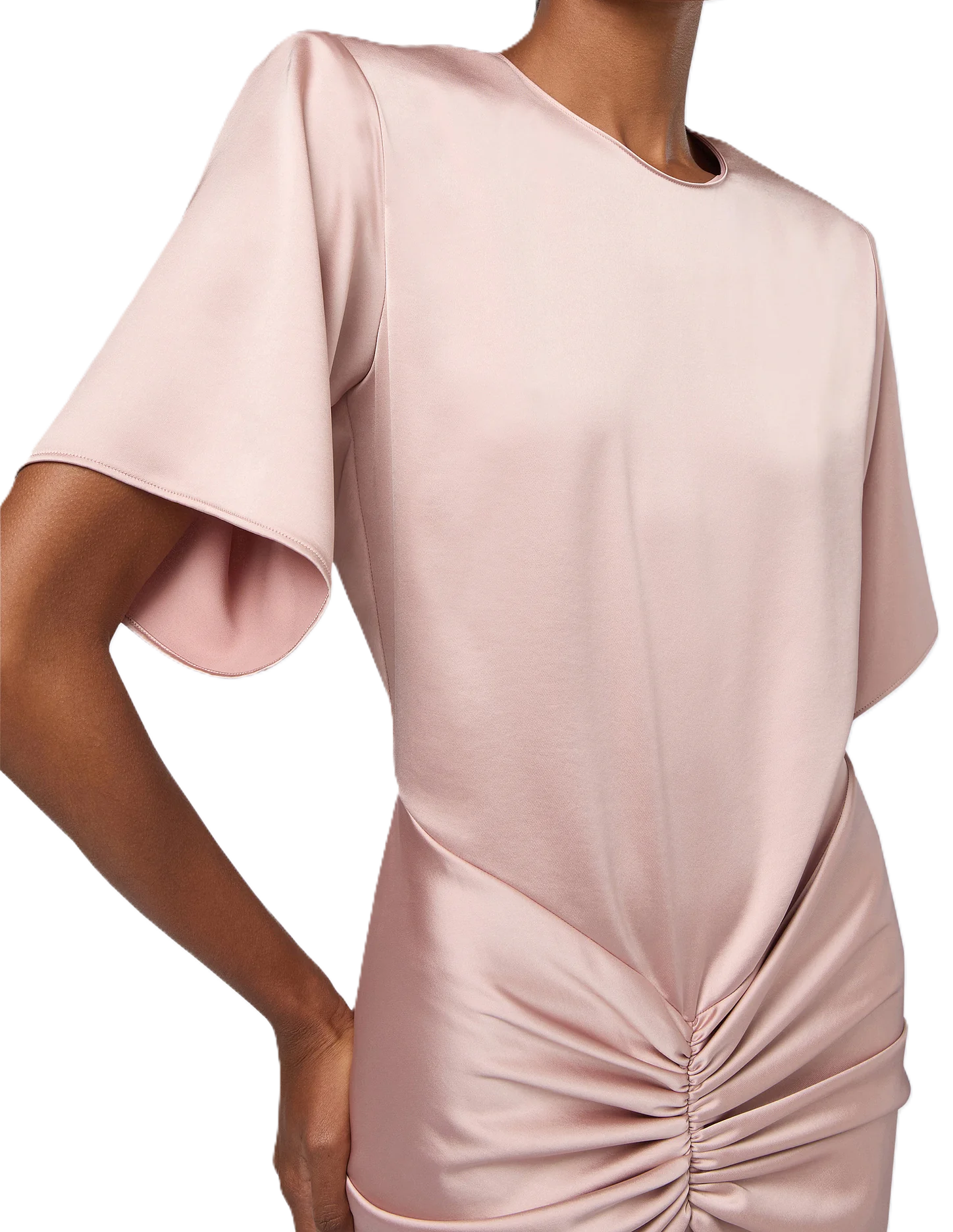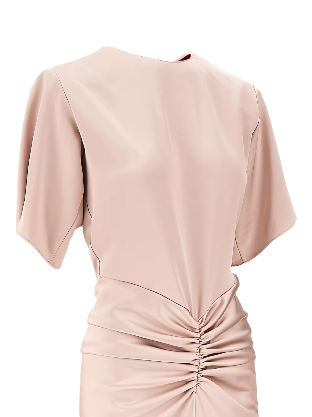 Abito rosa, maniche corte, ruches, girocollo, chiusura posteriore con zip