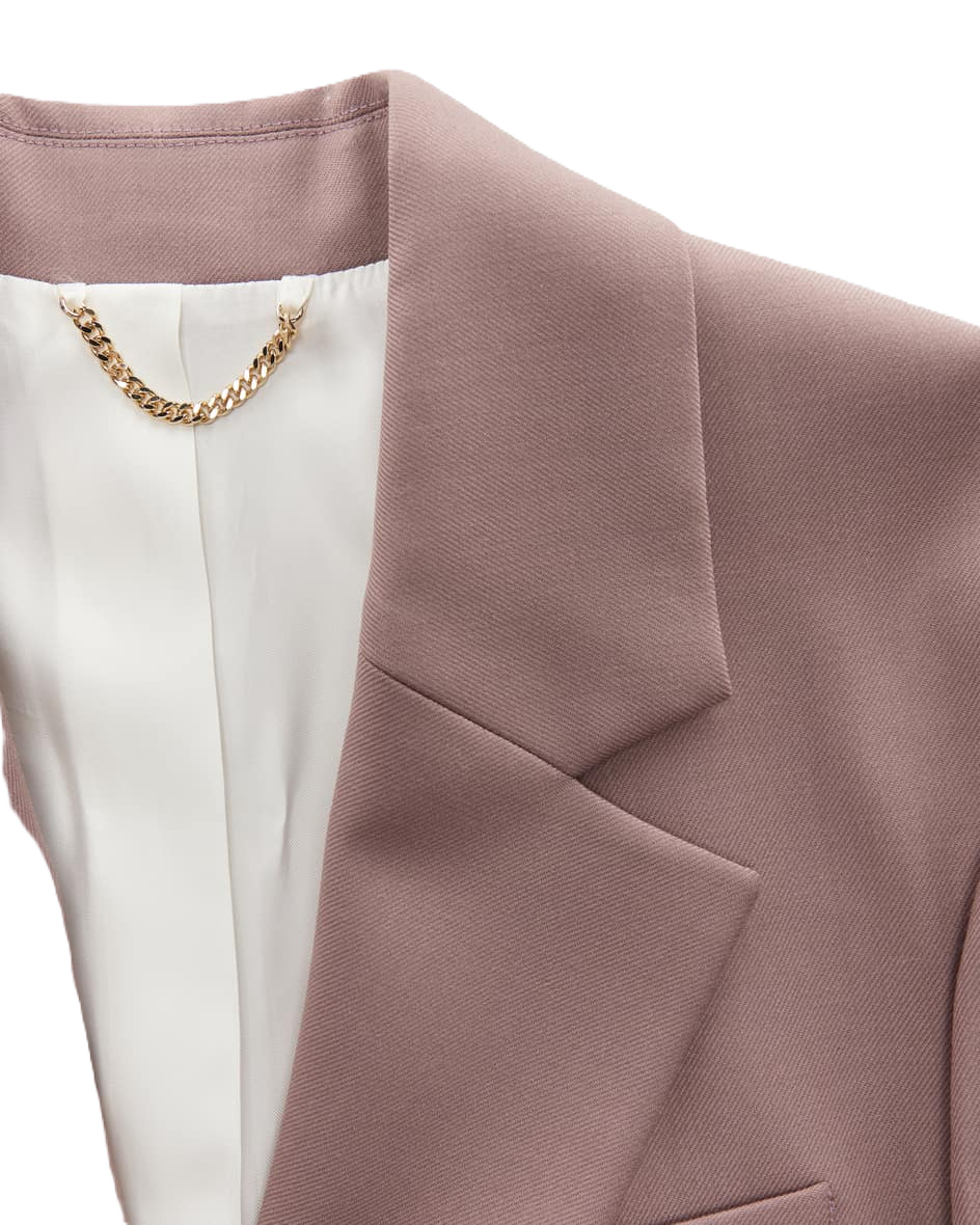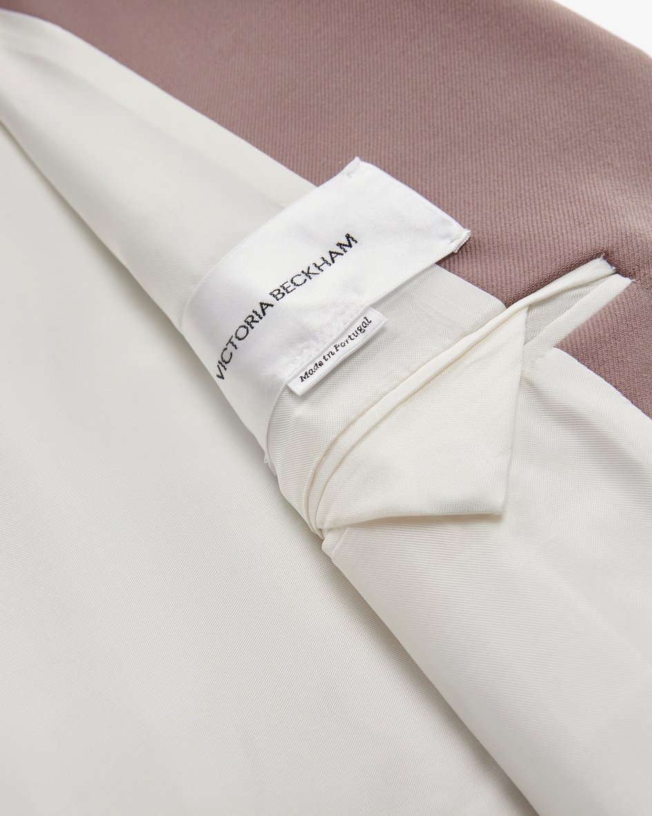 Blazer di Victoria Beckham in malva. Il modello dal taglio classico è un capo versatile, perfetto sia per look casual che business, mentre la fodera iridescente aggiunge un tocco di stile. La vestibilità aderente completa il look con un'eleganza femminile.