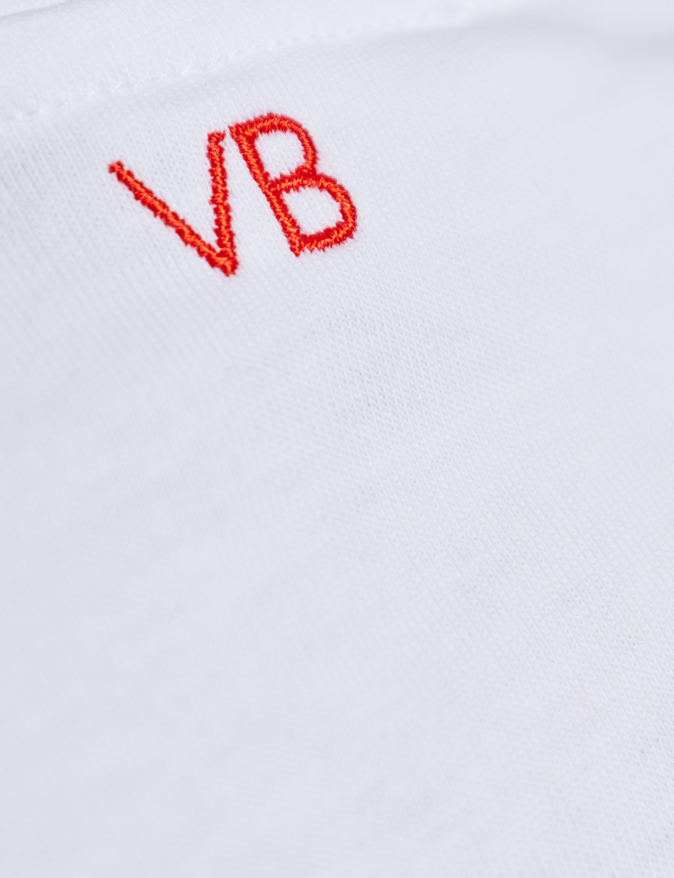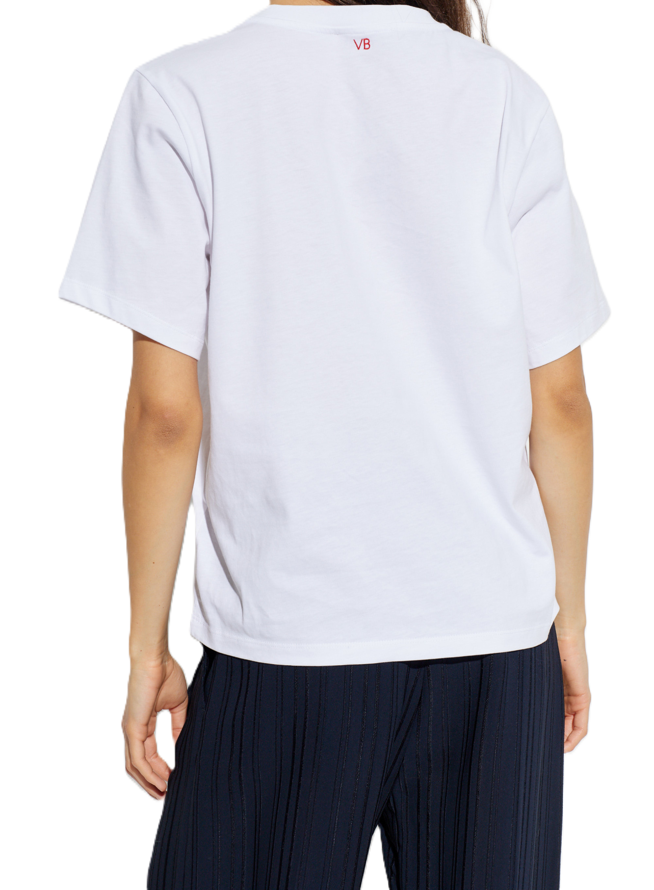 La t-shirt bianca si distingue per un'intrigante stampa nera sul davanti, che contrasta con la parte posteriore minimalista impreziosita da un discreto ricamo "VB" in una tonalità di rosso.