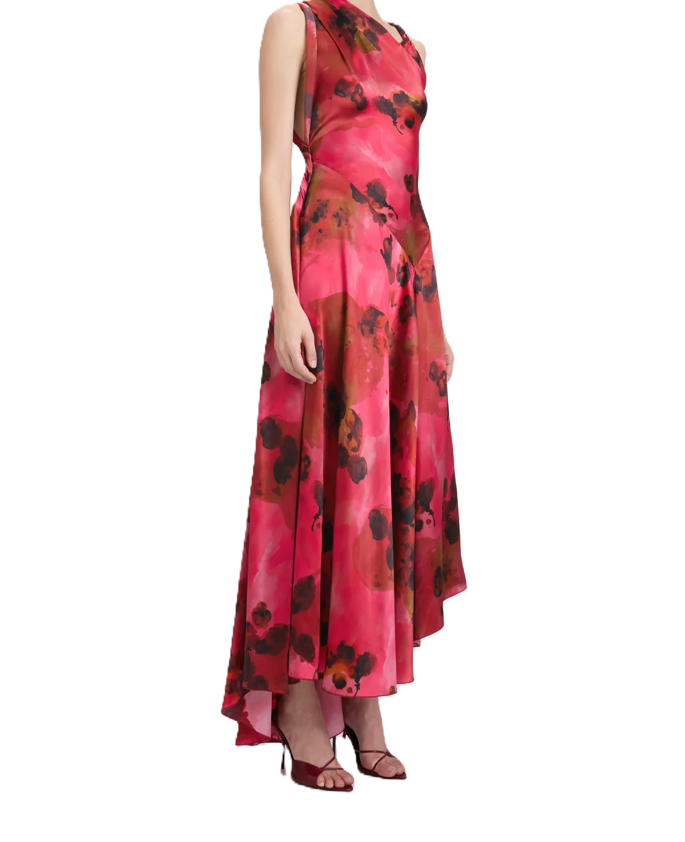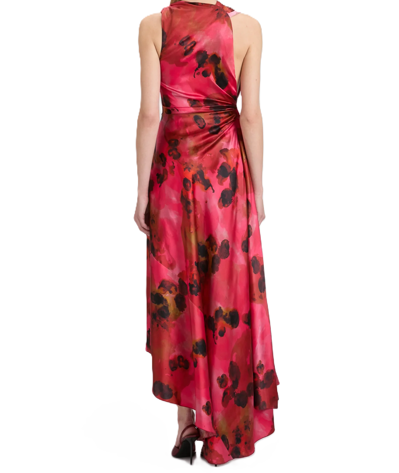 Scollatura e orlo asimmetrici conferiscono un tocco di tendenza all'abito midi drappeggiato senza maniche. Presentato in una vivace stampa floreale color lampone, è realizzato in 100% seta per una finitura tattile e ha una vita aderente per una silhouette lusinghiera. Le spalle plissettate e il dettaglio intrecciato sulla scollatura anteriore e sulle cuciture laterali aggiungono dettagli di design accattivanti.