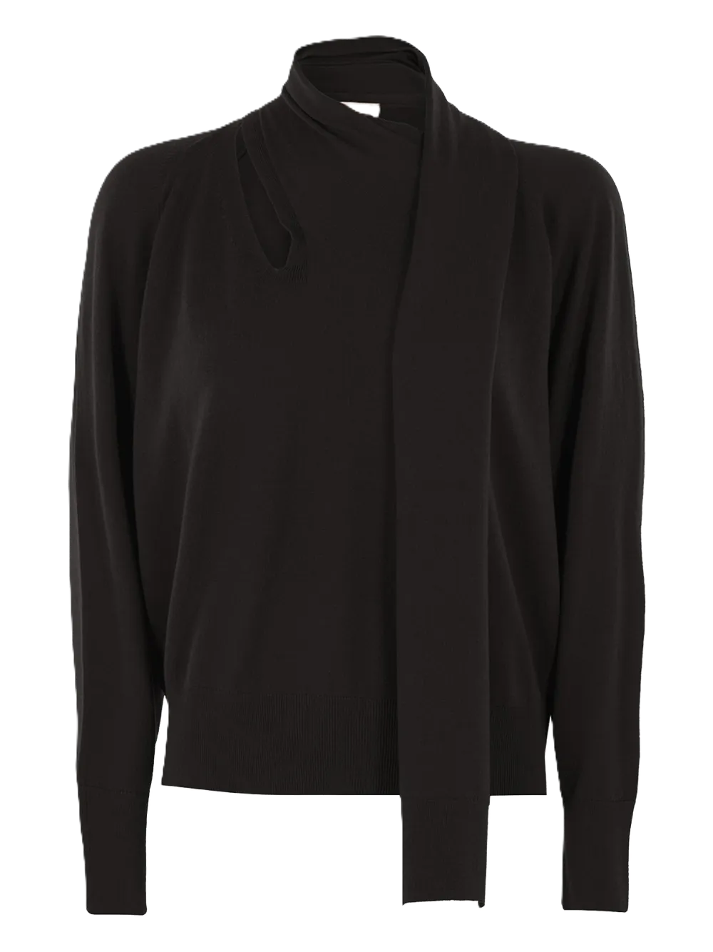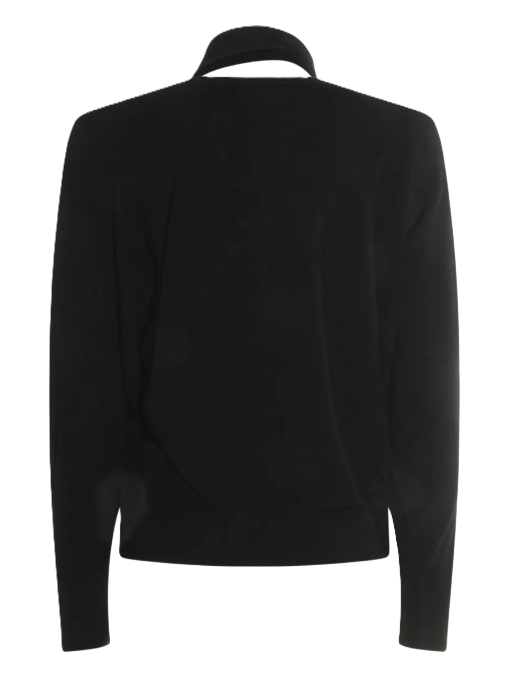 Maglione nero con collo lavallière, dettaglio con apertura a goccia, maniche lunghe